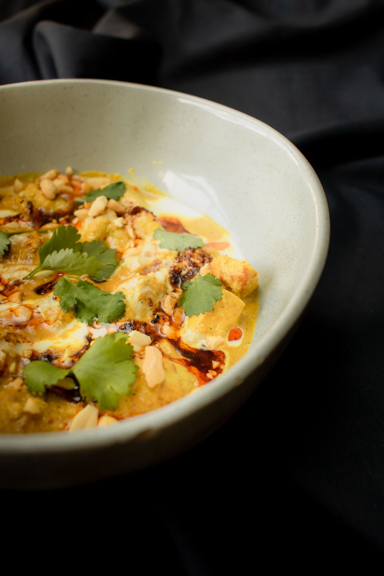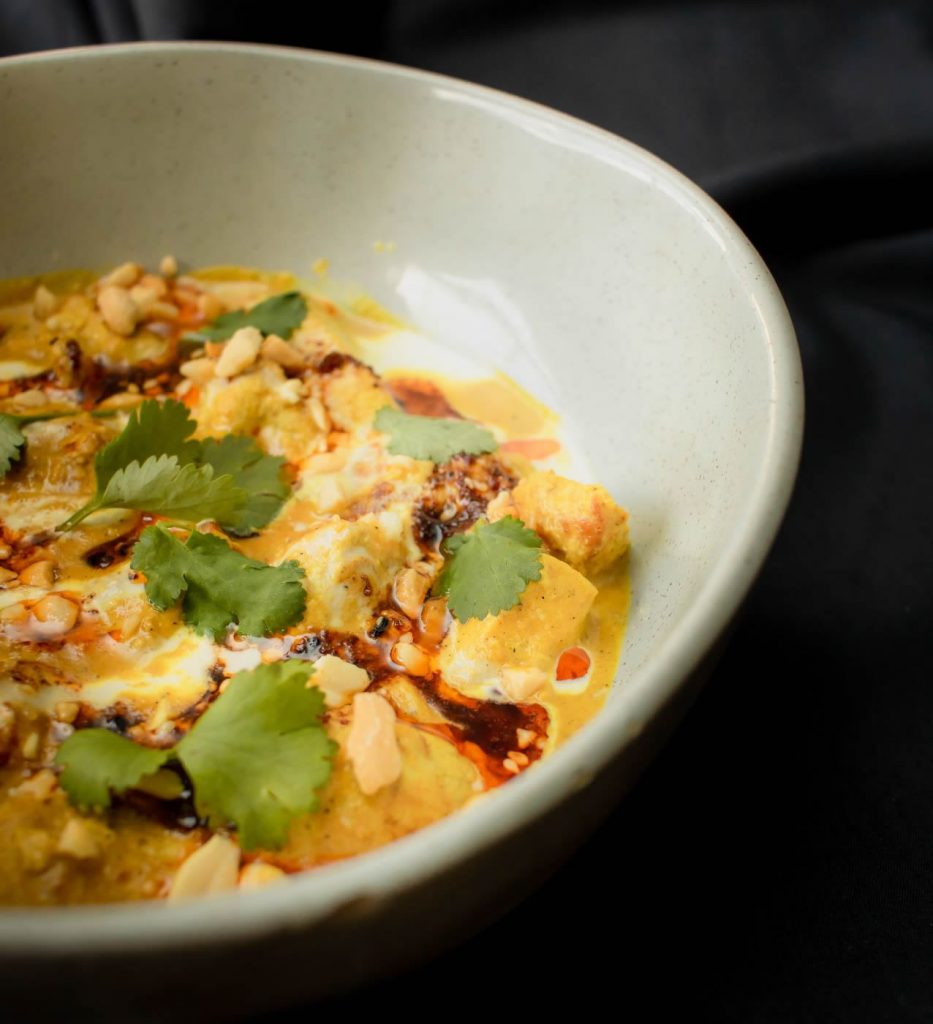 Pollo marinado estilo indio (picanto bajo), mani, cilantro