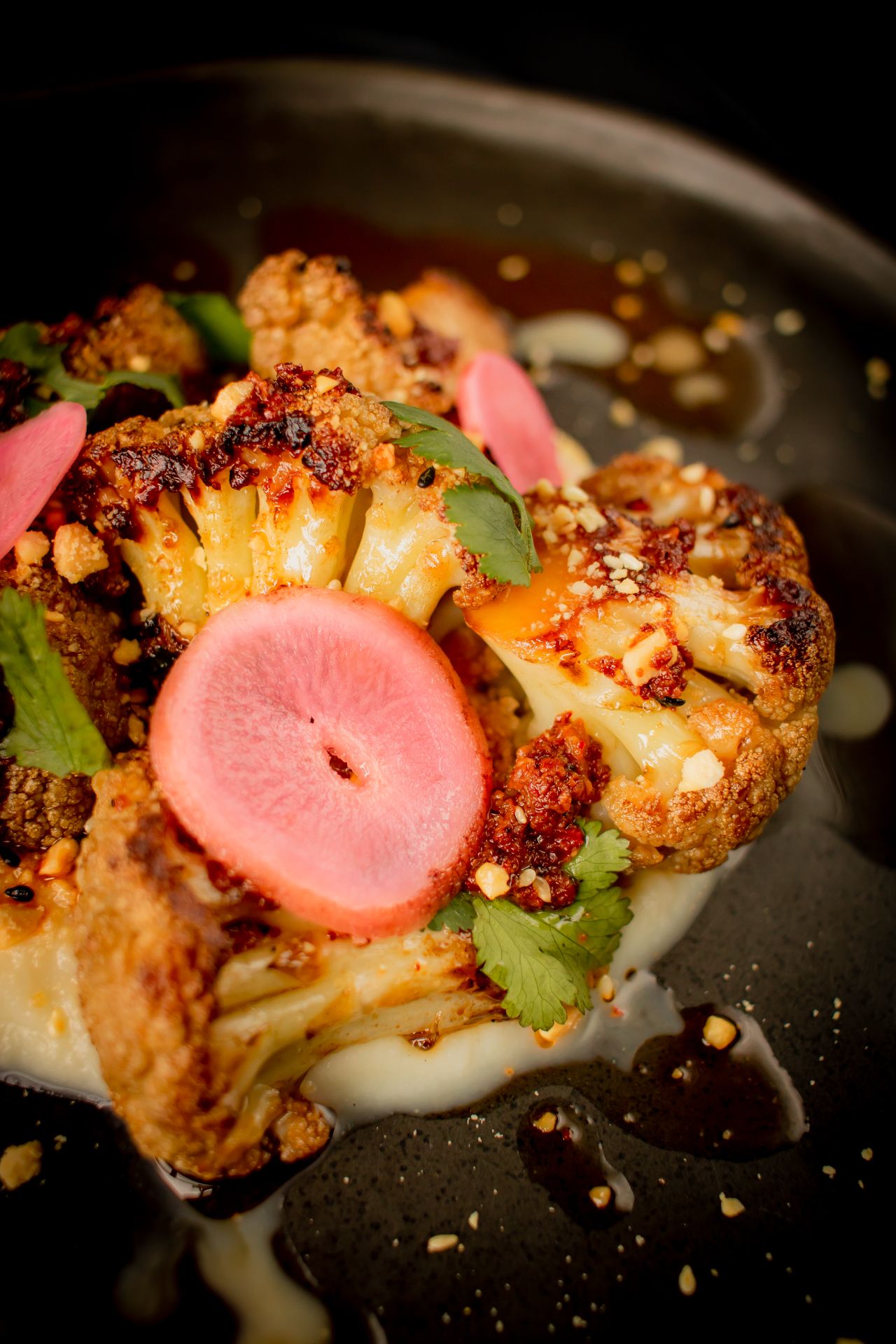 Salsa macha (picante alto), puré de coliflor